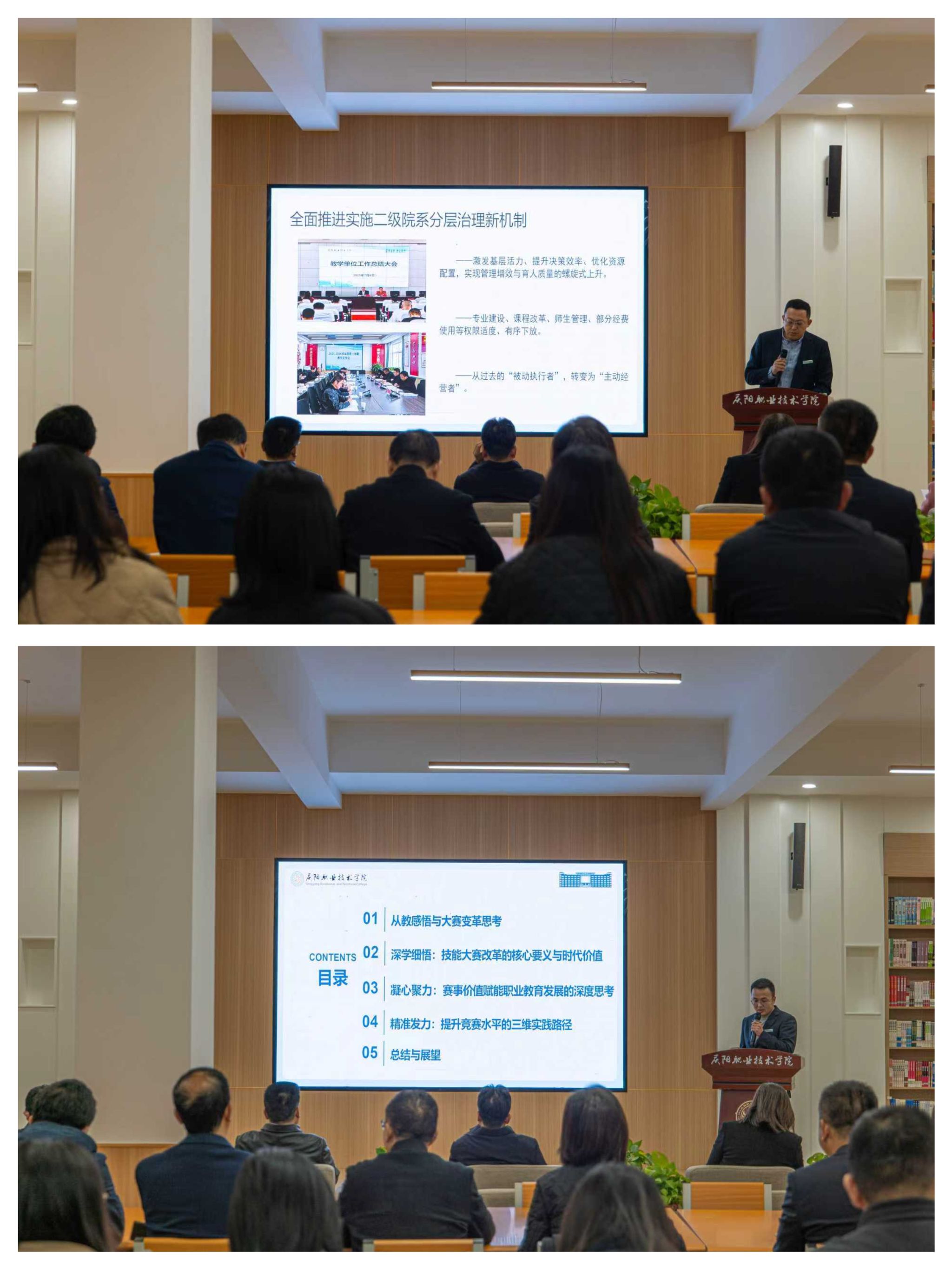会议强调,读书学习是安身立命之本,是实现个人成长的根本途径,研究创新是内涵提升的基础支撑和推动学院高质量发展的核心动力。要以“三讲六新三促”为抓手,学习政策、研究问题、创新实践,在专业建设、人才培养、校企合作等方面谋实招、求实效;要坚持问题导向,聚焦师生关切和学院发展瓶颈,切实把学习交流成果转化为提升管理效能、促进教育教学高质量发展的实际行动,在高质量发展赛道实现“弯道超车”;要及时梳理分享内容,形成合理化建议,把活动参与情况、成果转化成效纳入干部考核体系,切实营造比学赶超、争先创优的浓厚氛围,推动实现以讲促学、以学促干、以干促成的良好局面。
