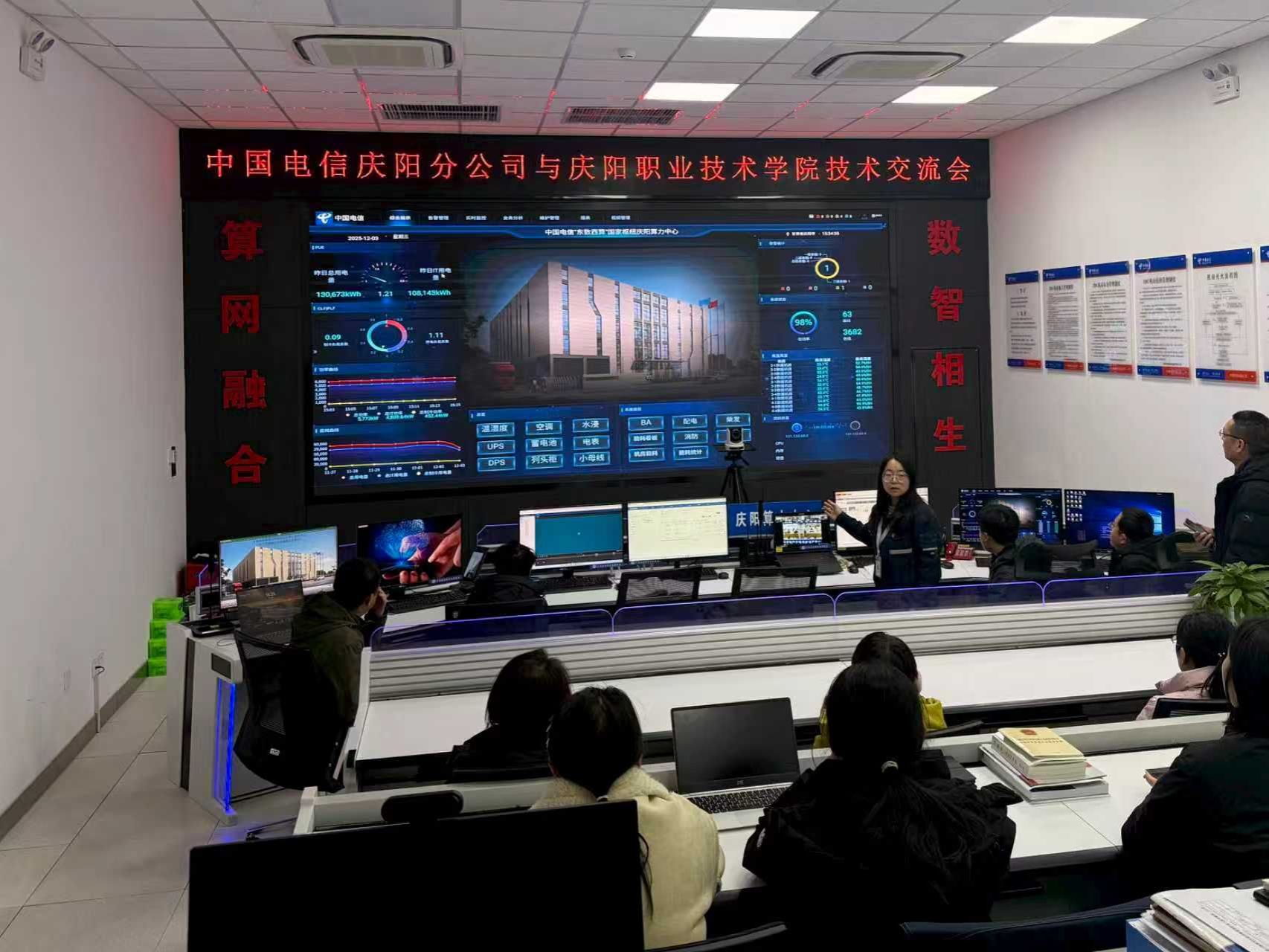 在园区数据中心,师生们深入机房一线,实地观摩了云电脑资源池管理、机架运维、设备巡检、算力调度等核心岗位工作场景。中国电信政企部党支部技术骨干现场讲解,生动展示了数据中心日常运营与维护流程,帮助师生直观理解“东数西算”战略的落地实践与产业价值。学生们认真聆听、积极提问,对数据中心岗位职责与技术体系有了更为具象的认知。