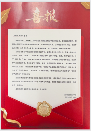 近日,兰州信息科技学院传来喜讯:数字信息系21计算机2班毕业生杜娇娇,在本科就读期间凭借扎实的专业能力与不懈的拼搏精神,荣获2024-2025学年国家励志奖学金。