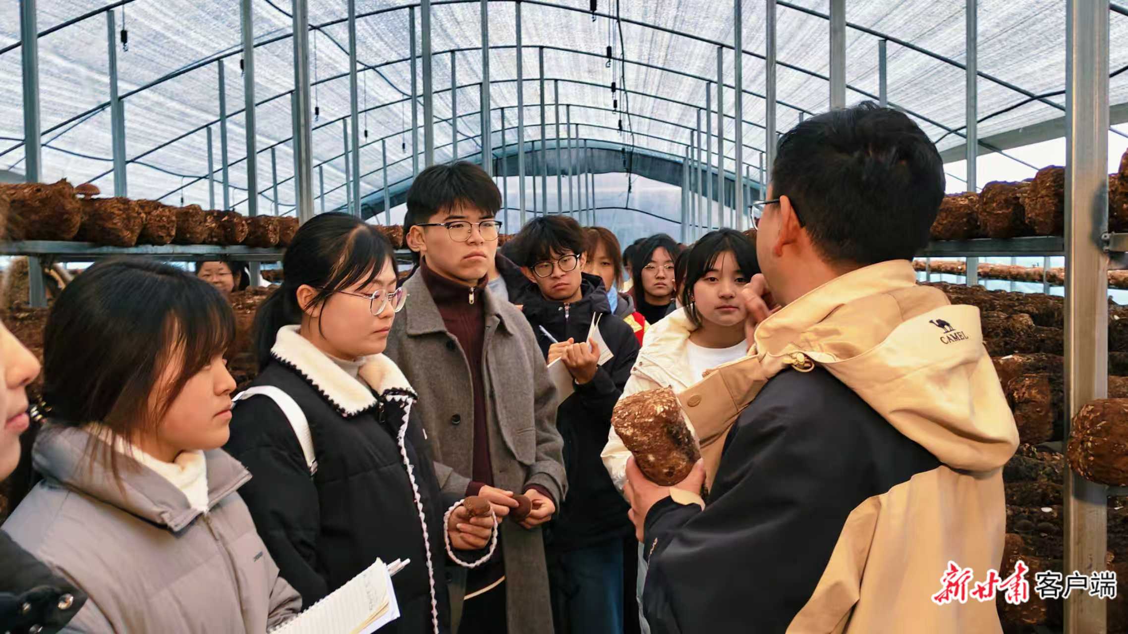在德源菌农业发展有限公司,返乡大学生学习菌棒接种、打包贴标技术,积极参与策划助农视频制作。