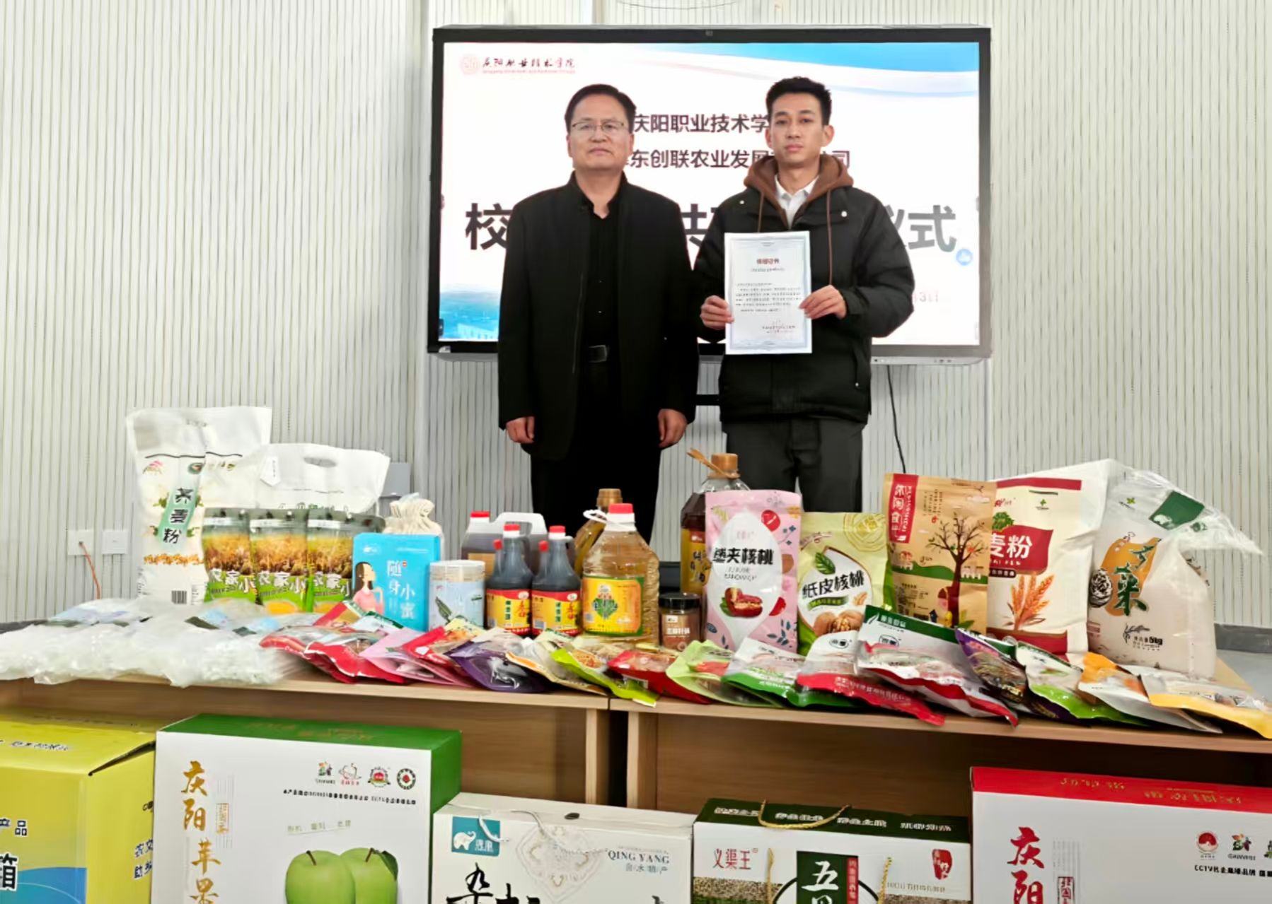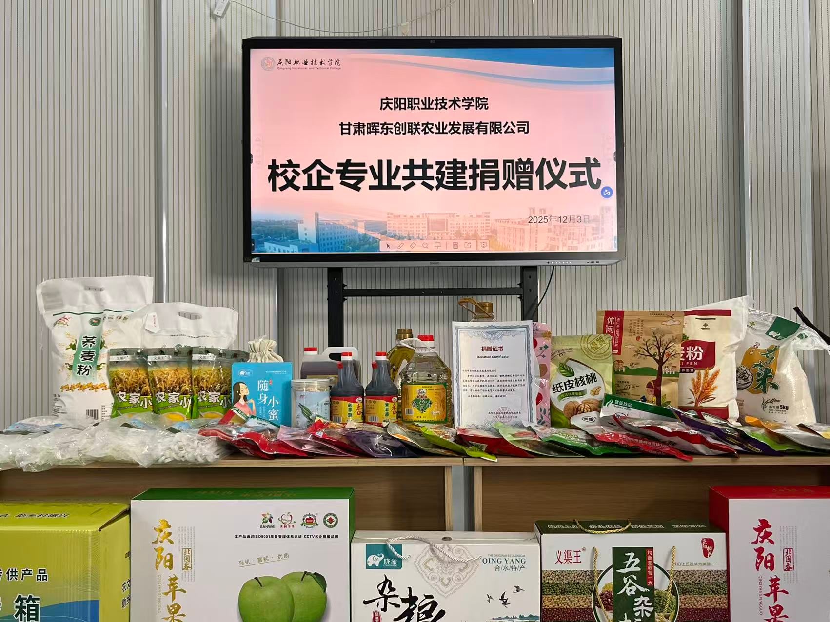 2025年12月3日,庆阳职业技术学院文化旅游系与甘肃晖东创联农业发展有限公司校企共建捐赠仪式在学院直播电商实训室顺利举行。学院党委委员、副院长杨三宁,甘肃晖东创联农业发展有限公司副总经理何建祥及企业代表共同出席活动。