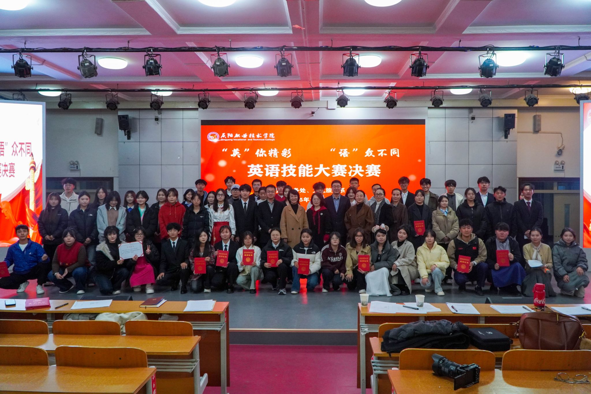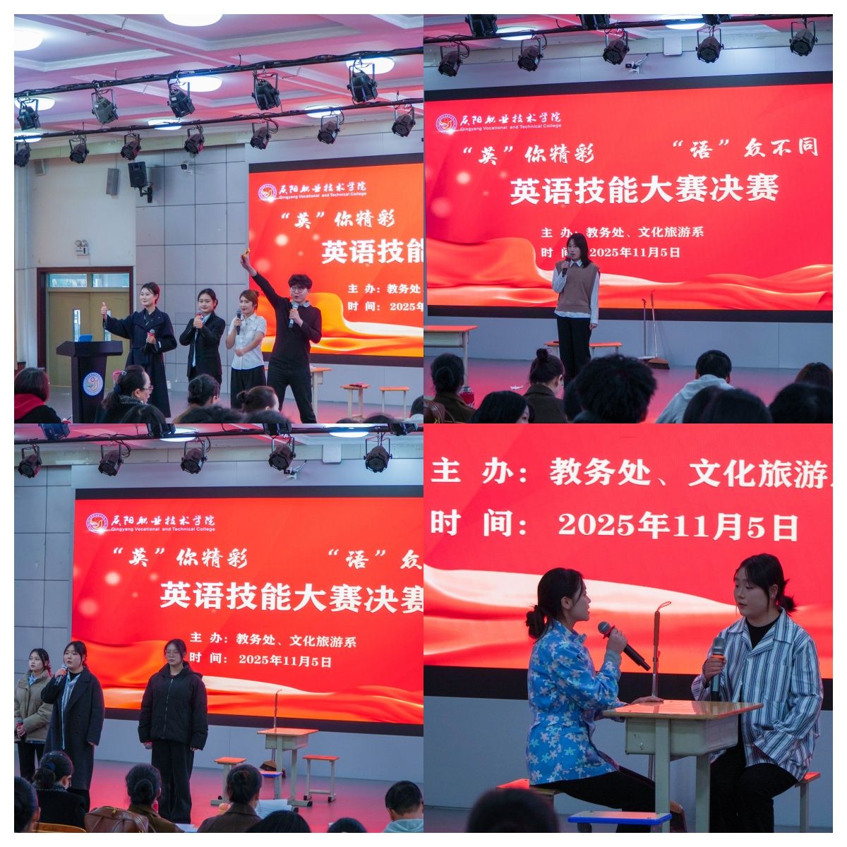 本次竞赛由教务处联合文化旅游系共同主办,以“以赛促学、以赛提能”为核心宗旨,聚焦学生英语综合应用能力与团队协作精神的双重提升,为学子搭建了锤炼语言、展示风采的优质平台。决赛现场,各参赛团队围绕自选主题展开15分钟脱稿展演,选手们凭借标准地道的发音、流畅自然的表达与创意十足的呈现形式,充分彰显了庆职学子扎实的英语功底与朝气蓬勃的精神风貌。整场赛事紧张有序、亮点纷呈,评委团围绕内容主题、语言表达、流利程度、表演技巧、时间把控及仪表形象等维度进行公正严谨的综合评判。