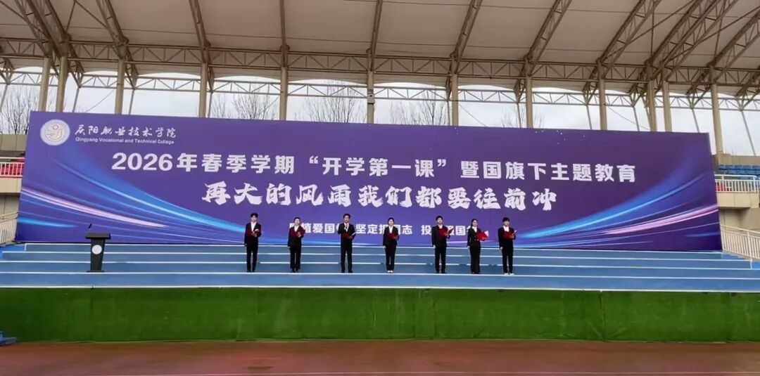 3月2日清晨,庆阳职业技术学院在田径场举行2026年春季学期思政教育“开学第一课”暨国旗下主题教育活动。学院领导班子成员、全体中层干部、全体辅导员及在校学生参加活动。党委副书记、院长胡志玉主持活动。