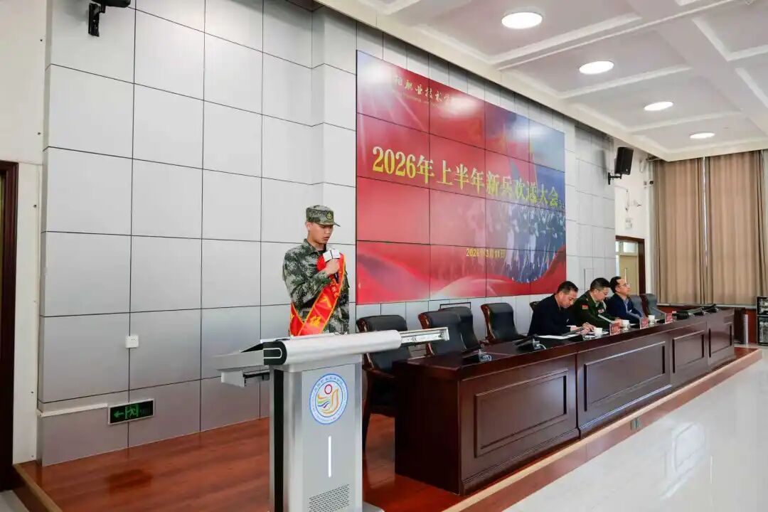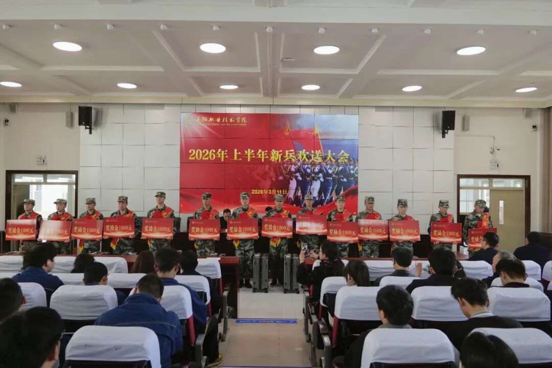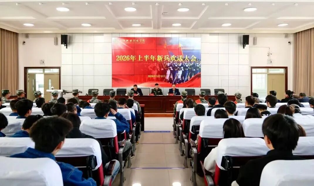 3月11日下午,庆阳职业技术学院为2026年上半年入伍新兵举行欢送大会。庆阳军分区动员处处长马向东、学院党委书记张建军出席并讲话,党委委员、副院长李建杰主持,学院相关部门负责人及300余名师生、家长代表参加欢送大会。