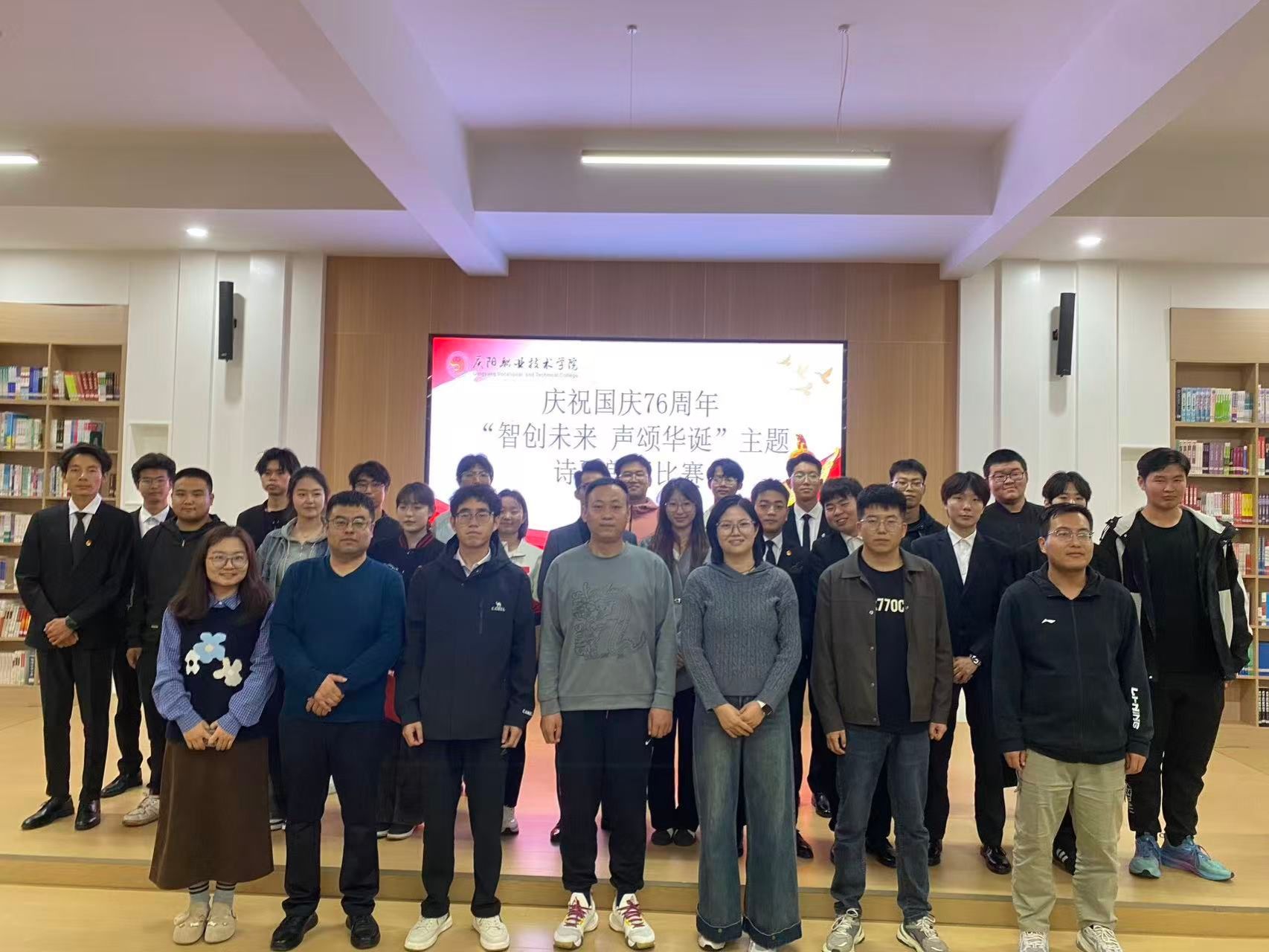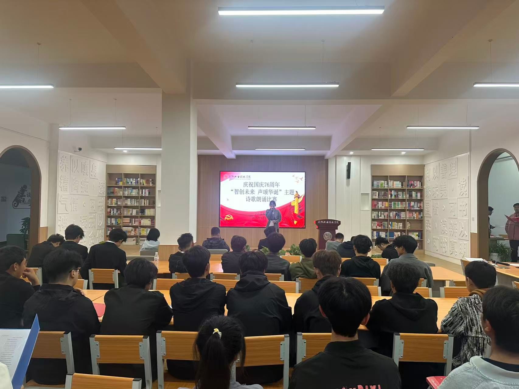 为庆祝华诞,激发广大青年学子爱国情怀,展现新时代青年的精神风貌,由智能工程系主办的 “智创未来 声颂华诞” 诗歌朗诵比赛于9月29日在图书馆学术讲堂圆满举行。本次比赛吸引了众多同学踊跃参与,现场气氛热烈,邀请2025级辅导员(班主任)担任大赛评委,系党支部书记、团总支书记参加活动。
