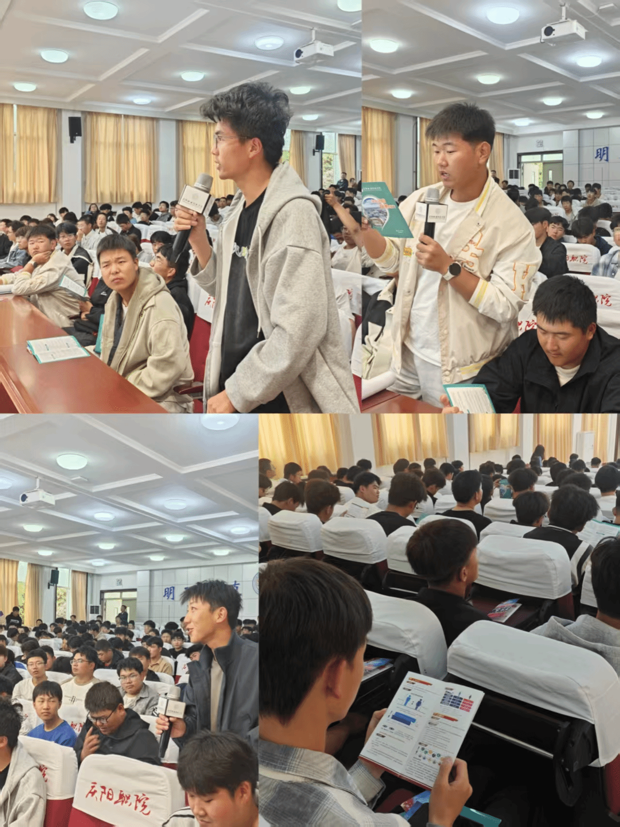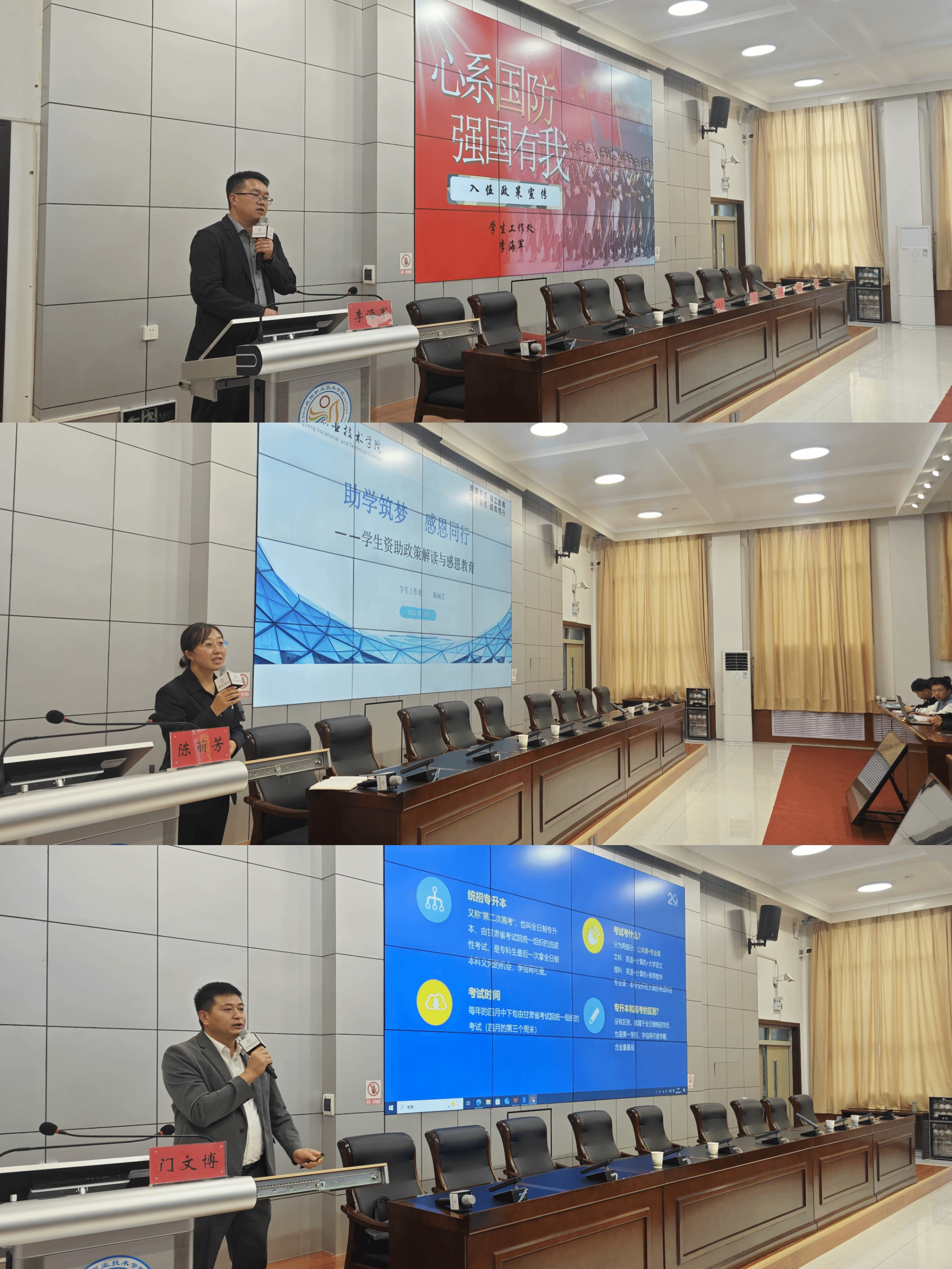 随后,学生工作处副处长李海军就国家征兵政策进行了系统解读,涵盖入伍条件、学费补偿、学籍保留及就业优待等热点内容。学生资助中心主任陈丽芳详细介绍了“奖、助、贷、勤、免、补”多位一体的资助体系。专升本选修课班主任门文博聚焦普通专升本、退役士兵专项计划等升学渠道,为有志深造的学生指明了方向。