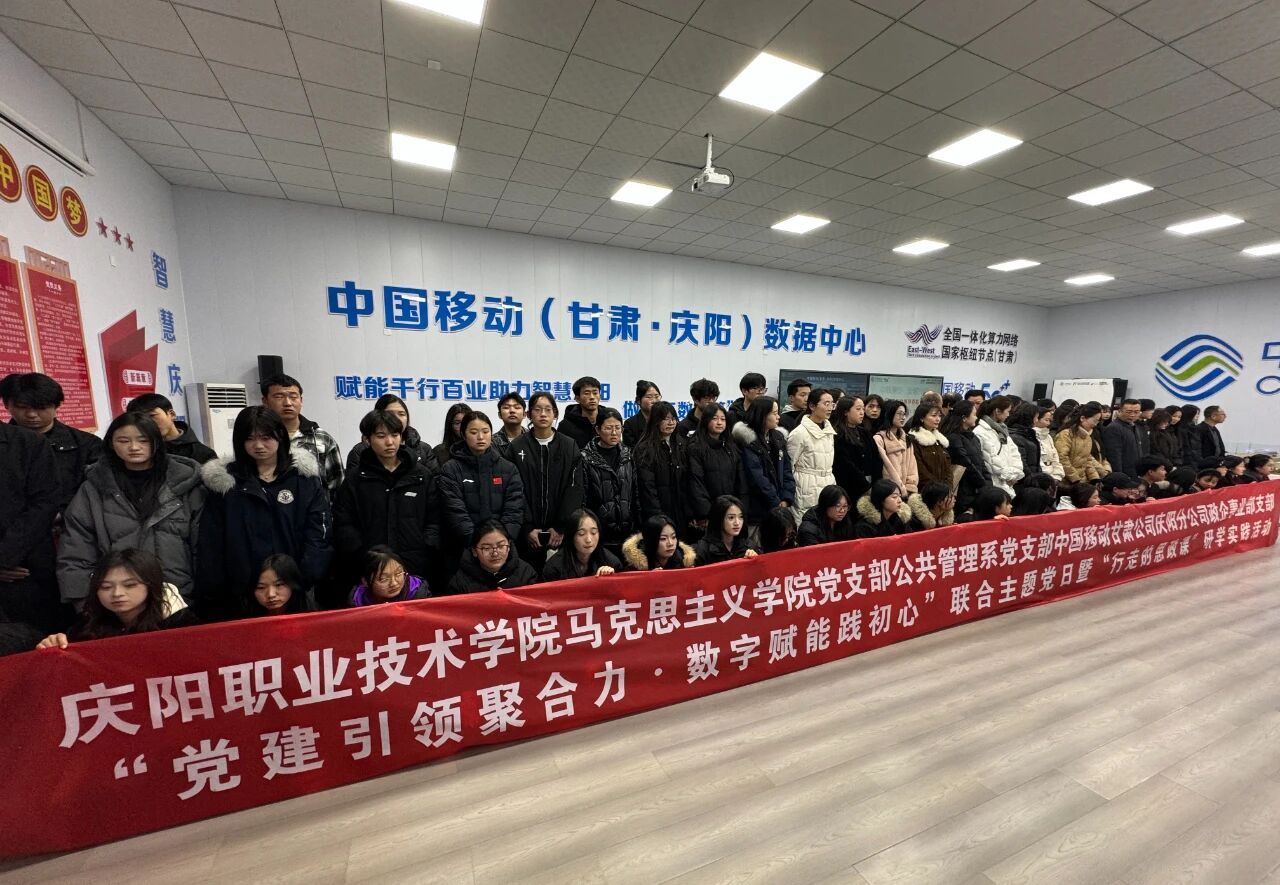 为深化党建与业务融合、推动思政教育创新,12月10日下午,庆阳职业技术学院马克思主义学院党支部、公共管理系党支部携手中国移动通信集团甘肃有限公司庆阳分公司政企事业部党支部,在中国移动(甘肃·庆阳)数据中心开展“党建引领聚合力·数字赋能践初心”联合主题党日暨“行走的思政课”研学实践活动。